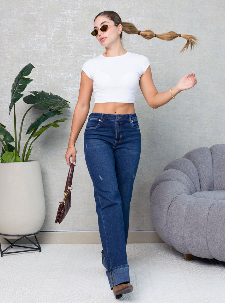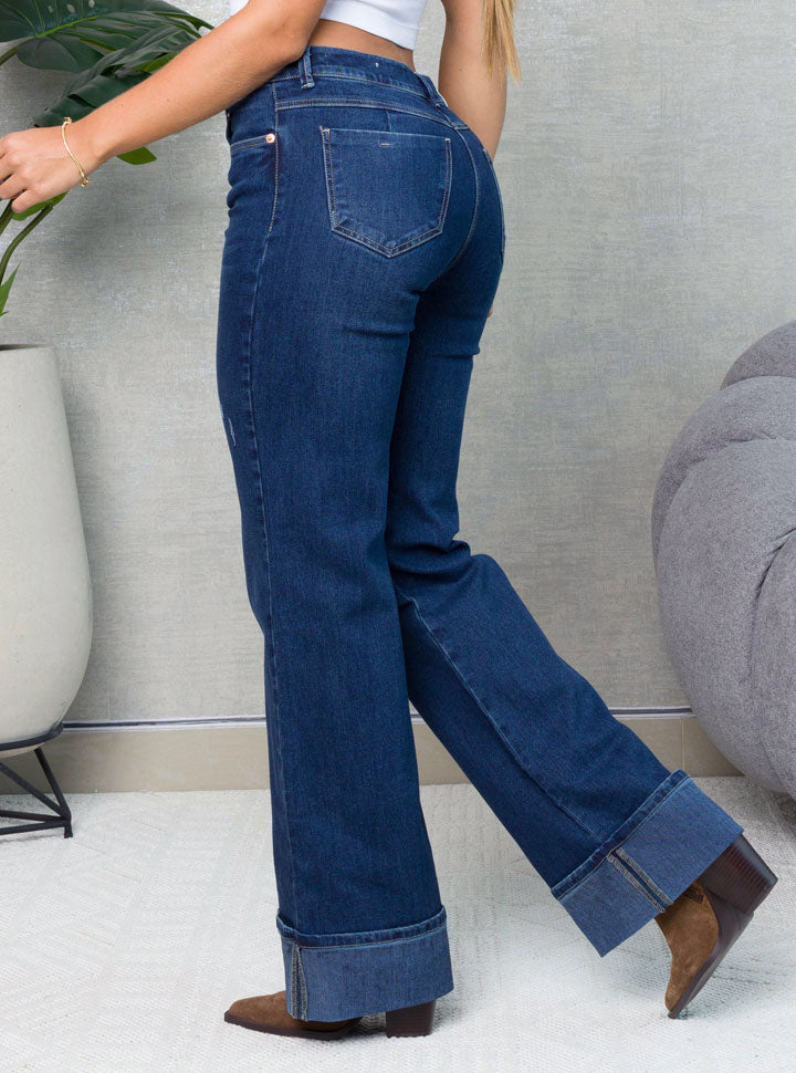 Un diseño diferente que resalta tu estilo. Este jean de bota ancha en tela stretch tiene tiro alto y una horma que estiliza con total comodidad. Su detalle de bota doblada le da un toque moderno y versátil, ideal para looks casuales o más sofisticados. Perfecto para quienes buscan un jean con personalidad y buen fit.