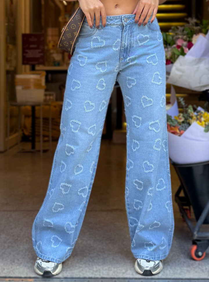 Jean bota ancha en tono claro con patrón de corazones en todo el diseño que le dan un aire trendy. La amplitud de la bota proporciona comodidad y movimiento, mientras que el patrón de corazones añade personalidad y un toque romántico al diseño.