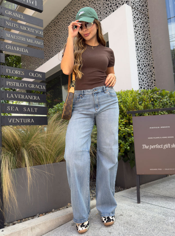 Jean bota ancha en stone claro con textura en la tela que añade carácter al diseño. Destaca por su pinza horizontal en la rodilla interna, un detalle sofisticado que define la forma y proporciona movimiento natural.