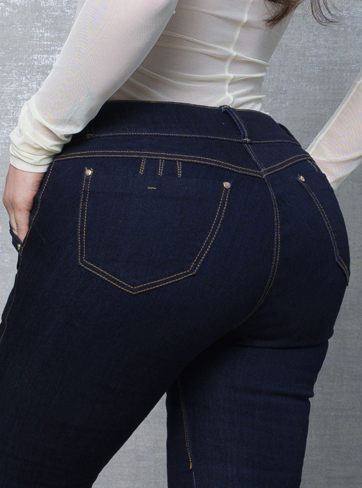 Su tiro alto y pretina semi-ancha con doble botón estilizan la cintura, mientras que la bota campana alarga visualmente las piernas, logrando un look elegante y favorecedor. La vena delantera añade ese detalle sutil que estiliza aún más y eleva el diseño con un acabado moderno y sofisticado.