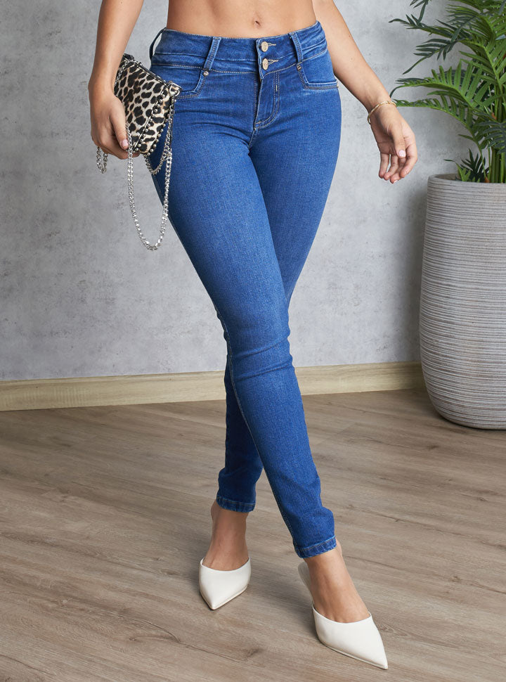 Este jean skinny destaca por su doble costura en la pretina con cierre de doble botón, que proporciona un ajuste seguro y cómodo. Su diseño push up realza la silueta, mientras que los detalles en los bolsillos traseros añaden un toque sofisticado y único.