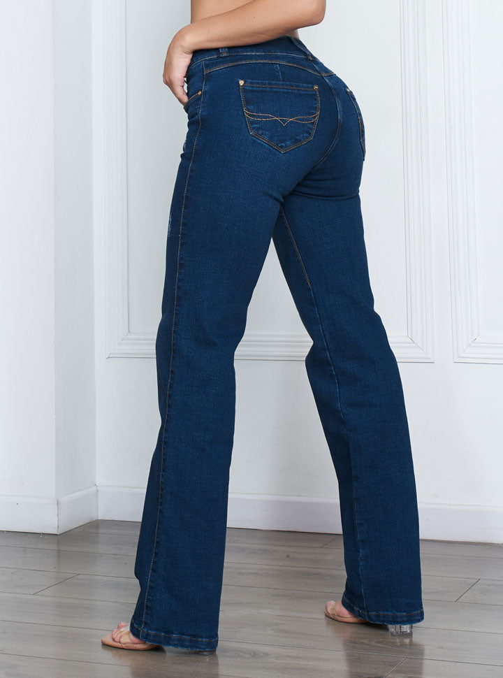 Este jean de bota recta en tono stone claro ofrece un ajuste push up que define la silueta realzando la figura. Cuenta con bolsillos traseros que incluyen cierre de doble botón para mayor seguridad y diseño diferenciado.